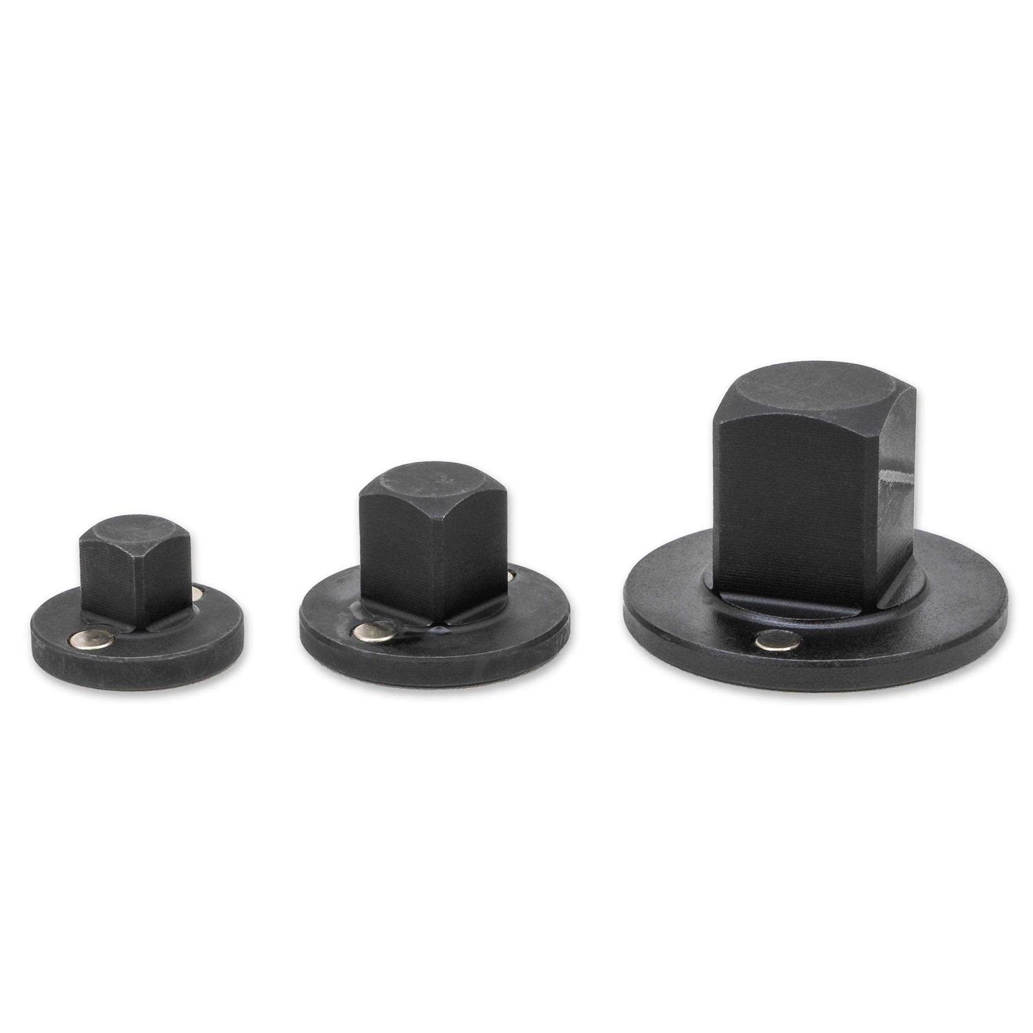 These unique socket adapters allow you to reduce the drive of your sockets without increasing your tool height. The low profile design allows for use in a wide range of applications. Allows you to reduce from 3/4″ drive to 1/2″, 1/2″ drive to 3/8″ or from 3/8″ drive to 1/4″ without making your ratchet and socket a lot higher than it is. Great for working in tight areas. These adapters feature a magnet retention device to keep them attached to the socket. Designed for impact or hand tool use. Made from high-strength, heat-treated Chrome Vanadium steel and are treated with a Manganese Phosphate coating to resist corrosion. Adapters can be stacked if additional drive reduction is needed. Comes in a set of 3pcs.