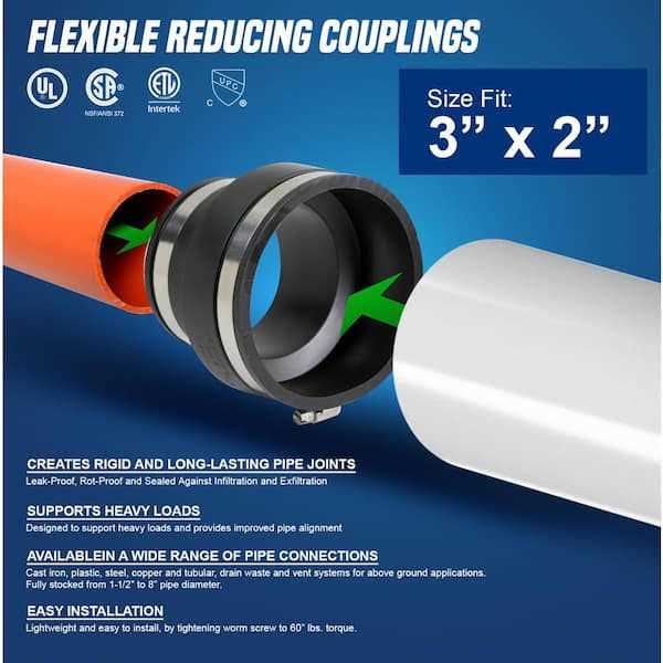 - Flexible coupling compatible with cast iron, copper, lead, and steel piping