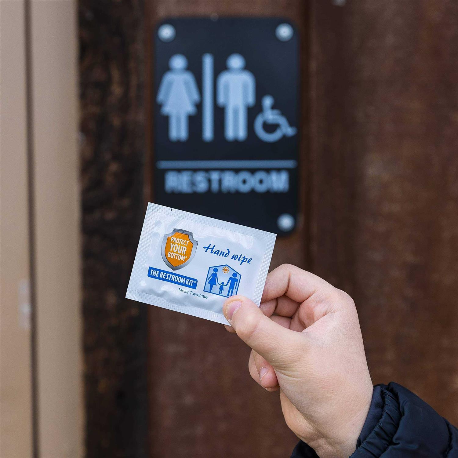 PROTECTION: Each kit is individually sealed so the consumer has fresh, clean sanitary toiletries to use in the restroom regardless of the environment. Perfect protection for anyone needing assistance when using a public restroom especially the elderly and children. PORTABLE: Conveniently fits into your backpack, purse, pocket or car for travel. Have peace of mind knowing you have a convenient, portable, and hygienic solution for public restrooms. BIODEGRADABLE: Dissolves easily in water. When done, just flush the bio-degradable seat cover, toilet paper and tush wipe PERFECT GIFT for the Holidays, Camping, Hiking, Outdoor Activities, Stocking Stuffers, Parties, BBQs or just treat yourself (perfect for anyone traveling day to day or on vacation). The first aid kit for public restrooms. The compact all-in-one kit that contains the essential items needed when using an under supplied or unsanitary restroom. The Restroom Kit guarantees sanitary essentials in any restroom you or your love ones will use. The kit contains a patented oversized seat cover, 3ft of 3ply toilet paper a hand and tush wipes. The kit is self contained, so the consumer has fresh, clean sanitary toiletries to use in the restroom regardless of the environment. Get an item that comes in handy when you least expect it. Protect Your Bottom!