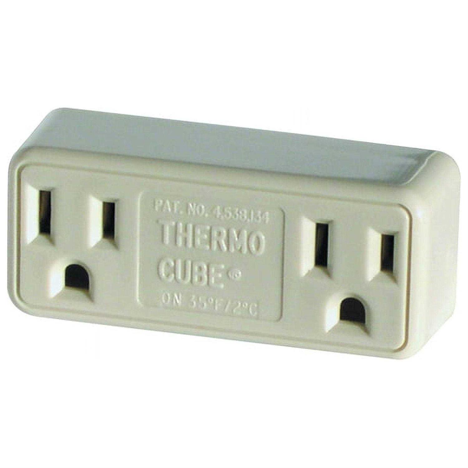 This temperature controlled thermo cube plugs into any standard 15 ampere outlet to provide electrical devices with temperature regulated operation. The dual receptacle device activates when temperatures lower to 35 degrees Fahrenheit and off when it hits 45 degrees Fahrenheit. Ideal for home and farm applications such as pond de-icers, unheated rooms, pump houses, greenhouses, boats and RVs. Helps to save money by only using power when temperatures require heating.