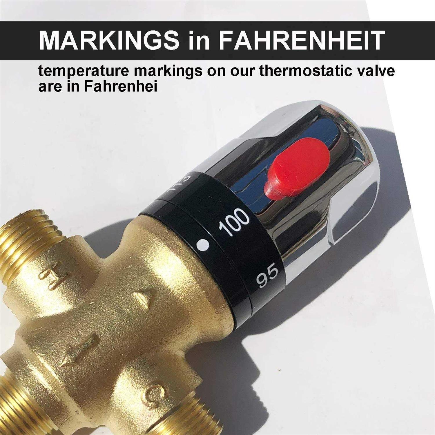 Thermostatic Mixing Valve with 1/2 NPT Male Connections,Water Temperature Control Valve,Solid Brass Material Brass Brand Atmama Outlet Connection Type MNPT US STANDARD FITTINGS-Coming with 3 PCS G1/2 British straight thread to 1/2NPT adapters. Markings in fahrenheit,outlet water temperature range: 68°F-122°F. Premium brass body: one-piece sturdy brass (non-plastics) faucet body ensures quality and longevity. If you need temperature over 100°F, just press the red button while rotating the valve It’s suitable for to pipe water valve, use for wash basin, bidet, shower, bathroom, washroom, kitchen, wash and etc. SPECIFICATIONS-Body Material: Solid Brass-Cartridge: Shape Memory Alloy (SMA)-Connection: 1/2″ NPT tapered threads, American plumbing standards-Inlet Cold Water Temprature Requirement: 34-84°F-Inlet Hot Water Temprature Requirement: 113-210°F-Outlet Water Temprature: 68-122 °F-Notice: press red knob and adjust temperature Package Includes 1x Thermostatic Mixing Valve,3X G1/2 to 1/2NPT adapters US STANDARD FITTINGS-Coming with 3 PCS G1/2 British straight thread to 1/2NPT adapters. Markings in fahrenheit,outlet water temperature range: 68°F-122°F. Premium brass body: one-piece sturdy brass (non-plastics) faucet body ensures quality and longevity. If you need temperature over 100°F, just press the red button while rotating the valve. It’s suitable for to pipe water valve, use for wash basin, bidet, shower, bathroom, washroom, kitchen, wash and etc.