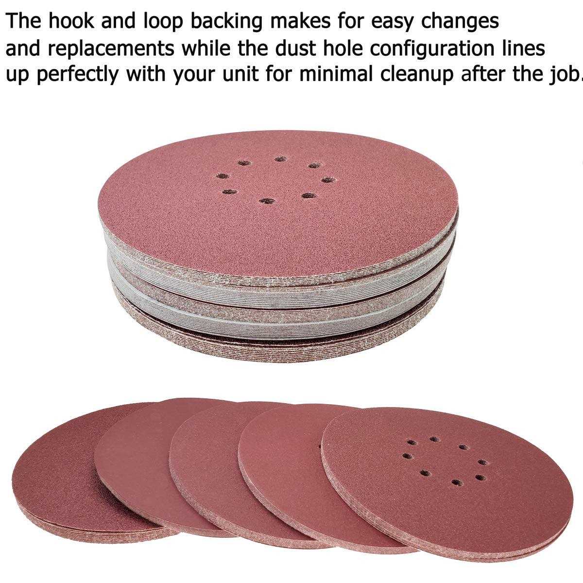 - 50 PCS 150 Grit 9 Inch 8 Hole Hook-and-Loop Aluminum Oxide Sanding Discs.