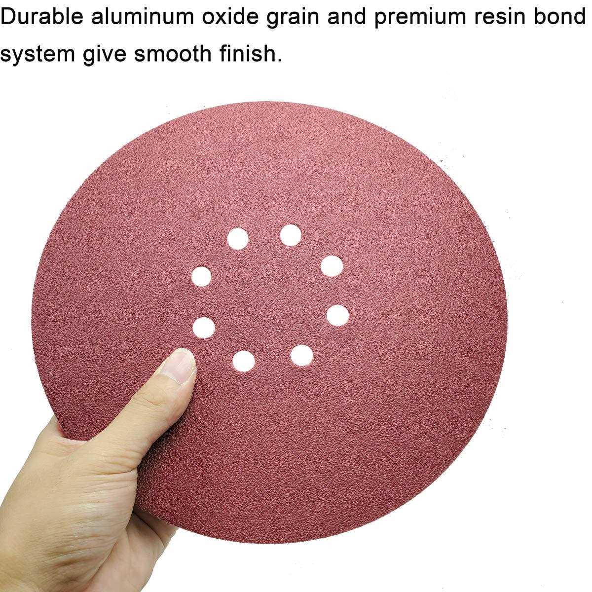 50 PCS 150 Grit 9 Inch 8 Hole Hook-and-Loop Aluminum Oxide Sanding Discs Hook and loop sandpaper backing makes grit changes quick and easy, and lengthens the life of the abrasive. Durable aluminum oxide grain and premium resin bond system give smooth finish. Hole configuration designed to fit the Drywall Sander This 9 inch sanding disk are widely used in car, wood projects, rubber, leather, plastic, stone, glass and other materials grinding, polishing