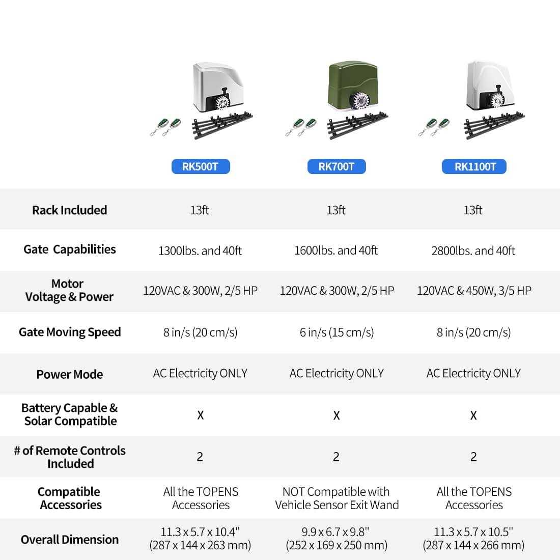 Designed for heavy duty sliding gate up to max 1300lbs. in weight and max 40ft. in length. This gate opener is ONLY powered by 110-120VAC electricity. A great variety of accessories to add on. Easy DIY installation with our video on YouTube. Get FREE M12 Remote Controls by sharing your experience!