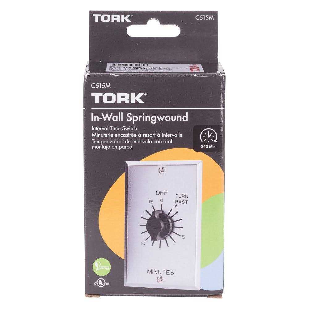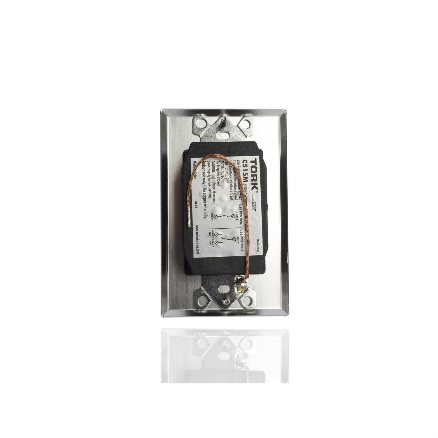 Style:0-15 mins The TORK C515M spring wound timer allows users to set fans, HVAC, whirlpools, motors, pumps and other appliances to automatically turn off, helping to save energy and money. The easy-to-use, twist dial timer features easy wiring with no neutral required, ideal for retrofitting existing wall switches. This timer is designed to replace any standard single or multi-gang wall switch. The ‘2-in-1’ switch configuration wiring can be used for SPDT and SPST. The operating temperature is 32 F to 122 F (o C to 50 C). The timer includes a metal aluminum wall plate with screw mounting, adding extra security for commercial applications. This timer is not to be used in precision timing applications such as with sun lamps and saunas where inaccurate timing could have dangerous consequences. TORK has been a pioneer in the mechanical time switch industry since 1922.