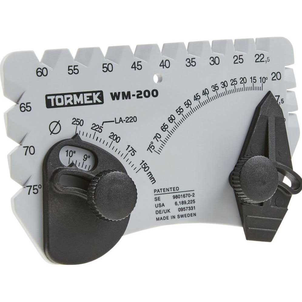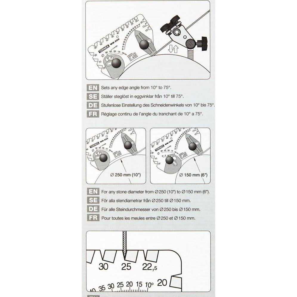 This patented AngleMaster has two functions: You can use it to set the jig to the grindstone so that it grinds your tool to any desired edge angle from 10 degrees to 75 degrees and you can use it to measure an existing edge angle on a tool. It is designed to work on any grindstone diameter from 250 mm (10″) down to 150 mm (6″). You achieve an exact setting irrespective of the degree of stone wear. The Angle Master has two magnets for convenient fixing onto the housing of the machine. Made in Sweden.