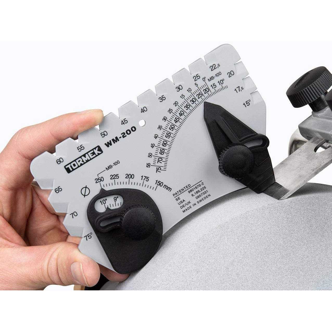 The Tormek WM-200 AngleMaster has several smart features that make tool sharpening easier. From measuring a tool’s existing bevel angle to helping set the sharpening angle on a jig or diamond grinding wheel, this handy tool can help. The Tormek WM-200 AngleMaster can be adjusted to the diameter of your grinding wheel. The Tormek WM-200 AngleMaster has several smart features: Set the jig to the desired sharpening angle before sharpening Set the sharpening angle when sharpening on the side of the diamond grinding wheel Measure the bevel angle of the tool The Tormek WM-200 AngleMaster comes with 2 magnets so it can easily be placed on any Tormek machine (except the 1200 and T-3). If your grindstone is worn down a lot, the Tormek WM-200 AngleMaster can be adjusted to the diameter of the grinding wheel (from 150 mm to 250 mm) so you still get an accurate reading.