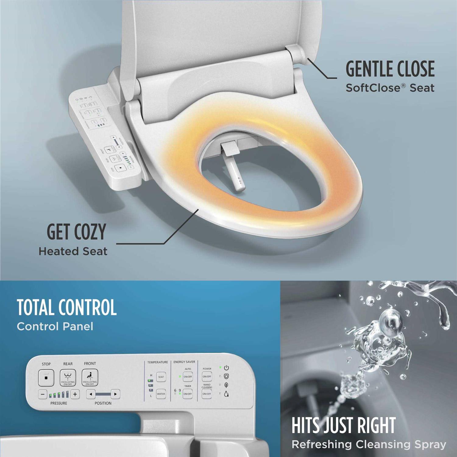 Using a bidet toilet seat reduces the need for toilet paper. The TOTO WASHLET A2 Bidet Toilet Seat delivers ecology-minded luxury with a streamlined design. It is fully automated, featuring a soft rear spray, rear cleanse, and front cleanse with the option of an oscillating stream. The control settings are located on a conveniently attached arm control panel. The spray wand is self-cleaning, intuitively cleaning itself before and after each use. The WASHLET features a heated seat that offers three temperature settings. The water spray has three temperature settings and five pressure settings. This bidet toilet seat provides an exhilarating and incredibly easy-to-use experience for everyone!