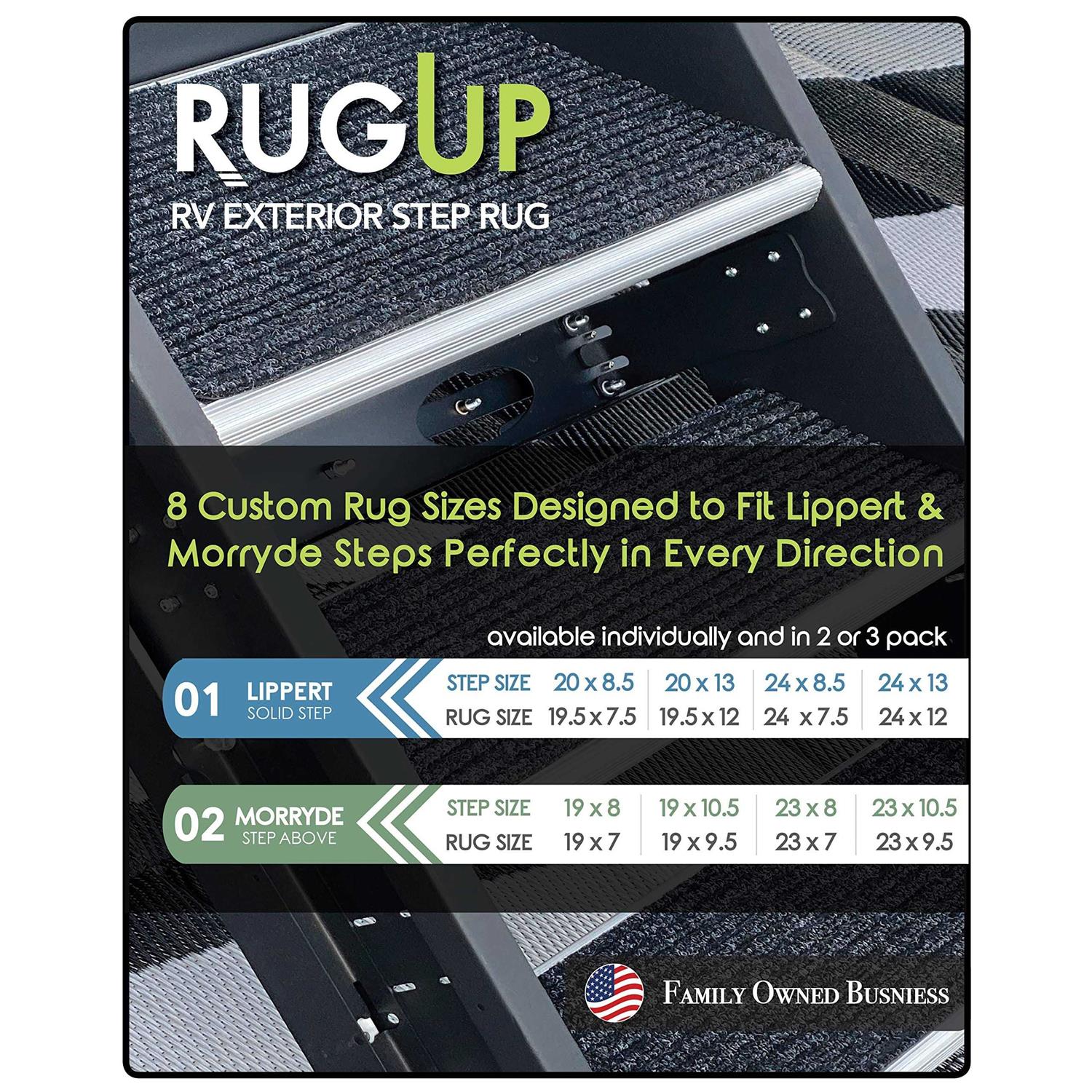 RugUP is – Arug design that is modern, sophisticated while providing superior step protection – AOur heavy – Aduty exterior rugs are designed to protect your step and are – Asecurely fasten but can easily – Abe removed and reattached at any time – A TheArigidArug texture is designed to trap dirt while protecting the step from any scratches Unlike other rugs, RUgUP is the only product that actually covers the entire step surface ensuring a safe step up and down for you and your pets – Afrom your RV