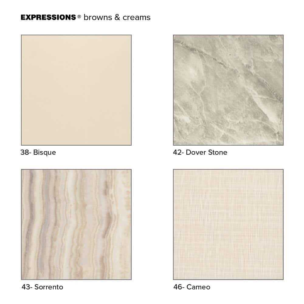 Discover why Transolid Expression walls would make a beautiful surface for your new bath and shower remodel. Whether you have a walk-in shower or bathtub, these bathroom wall panels are an excellent and economic option. Transolid Expression walls are made of a composite solid surface material which is non-porous, so there are no tiny little holes for the water, bacteria, or mold to creep into. Additionally, Expression walls are easier to install than traditional direct-to-stud shower walls because they glue-up right over the existing surface. The panels feature factory-finished outside edges and can be cut to size, making them adaptable for any bathroom. They are available in 3-solid colors and 6-gorgeous natural patterns that give the look of a high-end bath. The patterns are embedded into the material, creating a beautiful smooth surface that cannot scratch off. Wall kits include 3-wall panels (available in 72 in. panel height or 72 in. panel with a 24 in. extension), 2-color coordinated inside corner trim pieces, and a tube of silicone adhesive. Optional kits, such as window trim kits, storage pods, or shower bases are also available and can add a strong design element that really finishes out your space. Color: Brown/Cream.