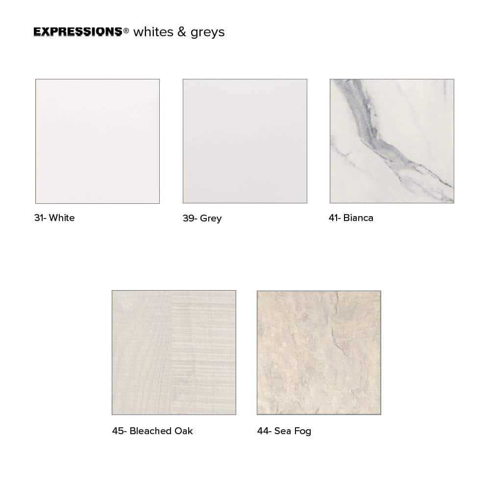 - Samples for Transolid Expressions white/gray colors: White, Grey, Bianca, Bleached Oak, Dover Stone, Sea Fog