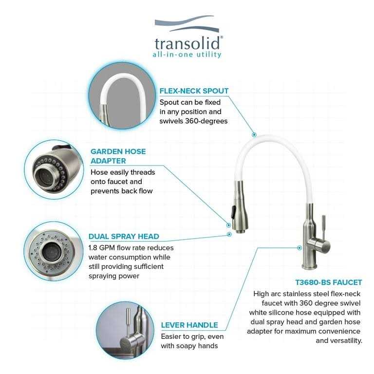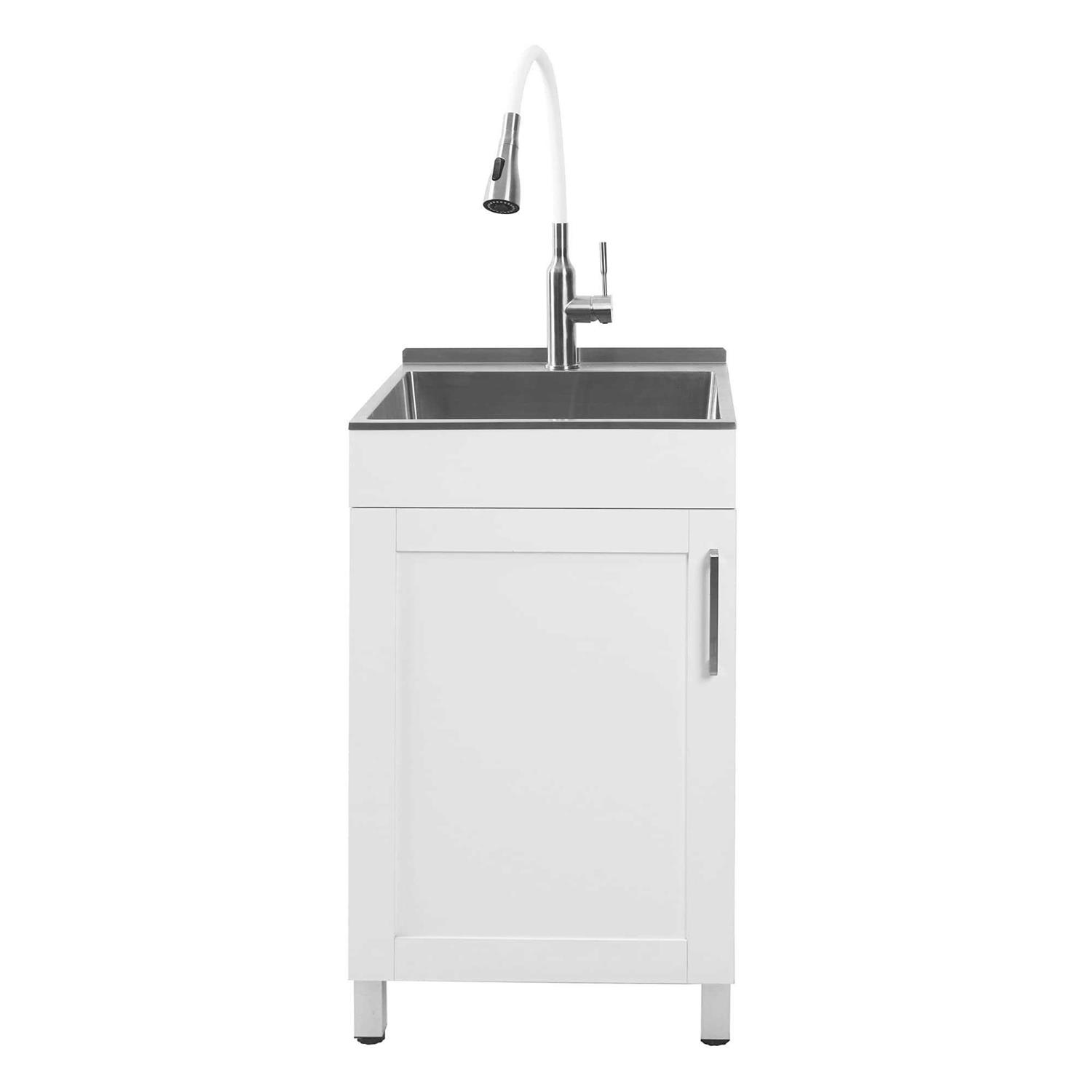 The Transolid TC-2020-WCW Laundry Cabinet combines beauty and convenience with its all-in-one functionality and space-saving design. Featuring a pre-built shaker style cabinet, spacious handmade stainless steel sink, and multi-function Flex+Freeze stainless steel faucet, this 20-in laundry/utility sink cabinet integrates seamlessly into even the smallest of available space in your home. Suitable for not only the laundry room, but the basement, workshop, or even the garage.