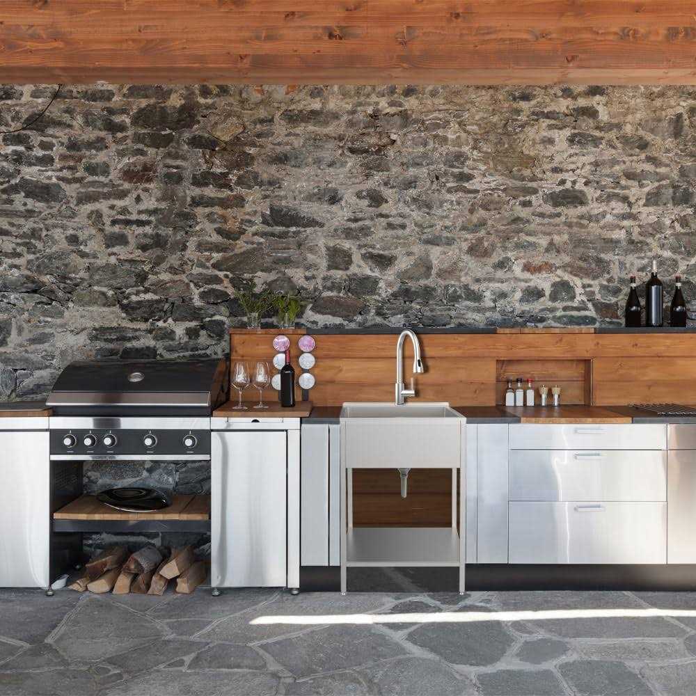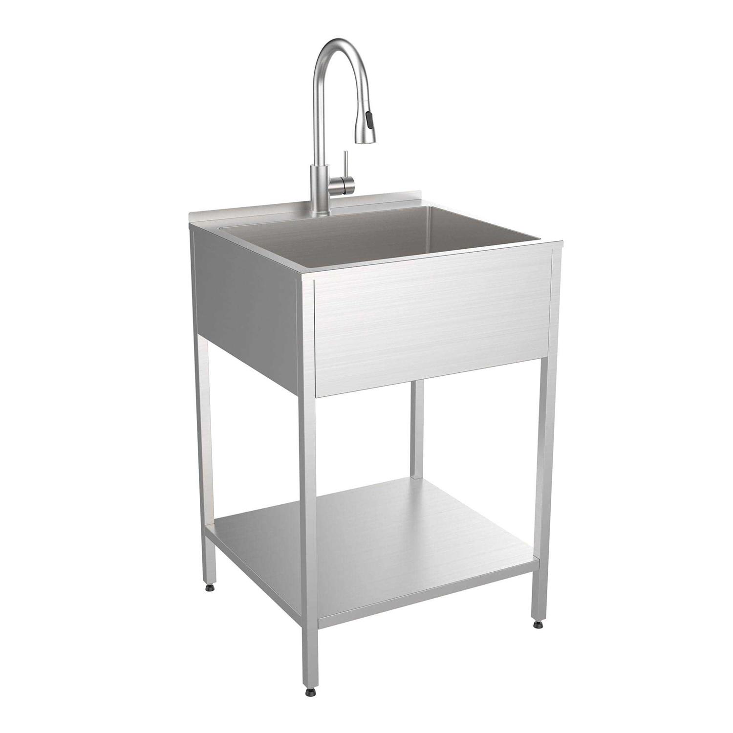 KIT INCLUDES: 24-in utility sink with washstand (assembly required) and pull-down faucet COMPACT AND VERSATILE: provides an economical solution without sacrificing quality or functionality, the compact design is perfect for use in the laundry room, art studio, outdoor kitchen, workshops, and more INDOOR/OUTDOOR USE: the sturdy construction paired with durable materials and UV protection ensures that our utility washstand is suitable for outdoor use while maintaining a sophisticated look for indoor use (not recommended for extreme weather) POWERFUL SINK: crafted with 18-gauge stainless steel sink, featuring a 10mm radius, integral backsplash, pre-drilled faucet hole, and sound deadening pads – our sink is not only durable and practical but also aesthetically pleasing POLISHED APPEARANCE: the contemporary design of this wash stand is enhanced by the concealed hardware and wrap-around apron – the durable, rust-resistant stainless steel material ensures that our sink can withstand the toughest of tasks