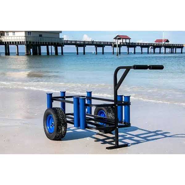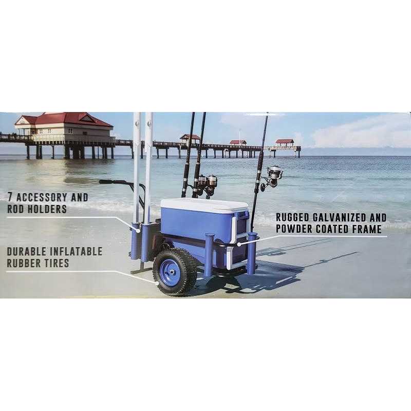 FEATURES: Built with a galvanized steel frame and finished with a powder coat that protects against salt and sand, ensuring long-lasting durability. Features pneumatic wheels for smooth and easy maneuverability, even over rough terrain. Built to hold up to a 54 QT. cooler and comes with seven PVC rod/accessory holders. Plenty of space to store all your gear and refreshments.