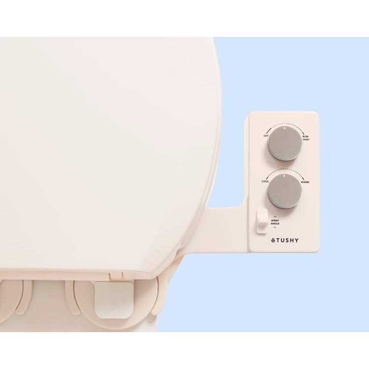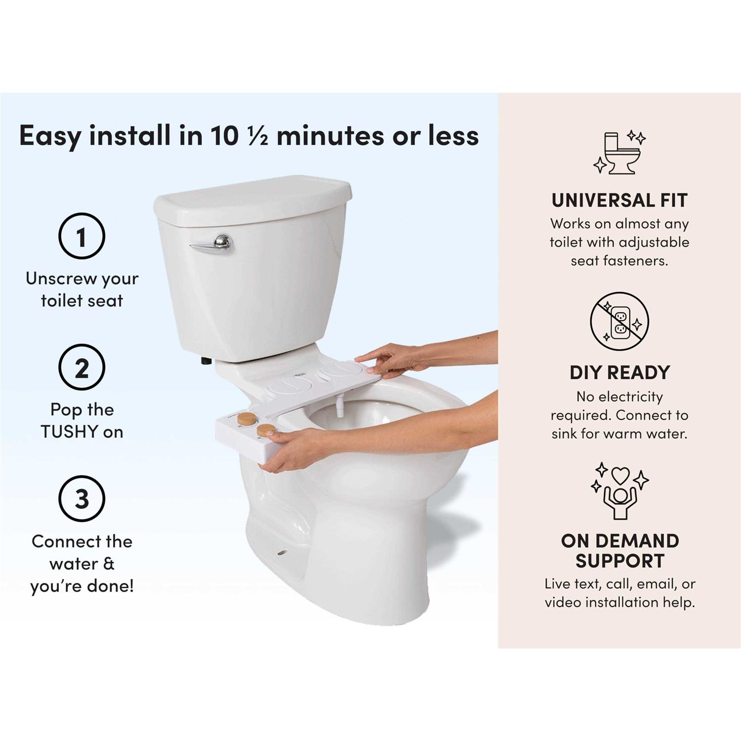 Soothing temperature control from cool to warm water for a comfortable clean. NEW Self Cleaning SmartSpray nozzle rinses before and after each use for a better clean. Automatically retracts when Classic 3.0 is turned off. Easy install in 10 minutes or less on most standard toilets. Universal fit on almost any toilet with adjustable seat fasteners for a secure fit and 6-foot long hot water connection to reach your sink hookup. NEW Water pressure control, now choose from a gentle to strong stream of clean water. NEW Precision nozzle adjuster gives you the control to comfortably clean your bum or front with a relaxing stream of warm or cool water. TUSHY Spa must be next to a sink to connect properly. TUSHY Spa must be next to a sink to connect properly. Soothing temperature control from cool to warm water for a comfortable clean. TUSHY Spa must be next to a sink to connect properly. NEW Self Cleaning SmartSpray nozzle rinses before and after each use for a better clean. Automatically retracts when Classic 3.0 is turned off. Easy install in 10 minutes or less on most standard toilets. Universal fit on almost any toilet with adjustable seat fasteners for a secure fit and 6-foot long hot water connection to reach your sink hookup. NEW Water pressure control, now choose from a gentle to strong stream of clean water. NEW Precision nozzle adjuster gives you the control to comfortably clean your bum or front with a relaxing stream of warm or cool water.