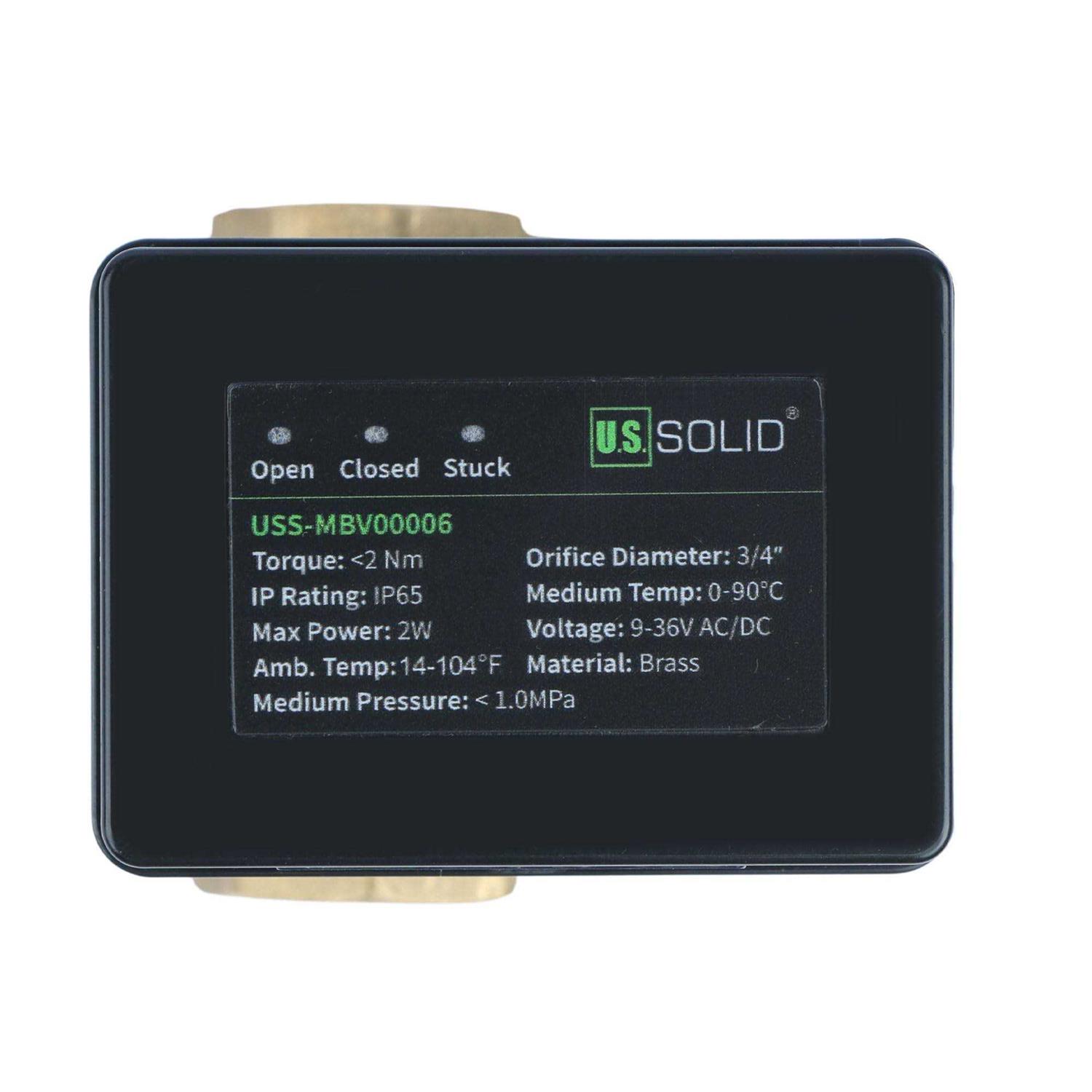 Intuitive Indicator Lights: This 2 wire motorized ball valve features an upgraded design with three indicator lights: open, close, stuck, intuitively showing you the current state for a safe and user-friendly experience. Auto Return: Unlike similar products on the market, this ball valve comes with a basic 2 wire connection which allows the valve to largely de-energize after closing. The valve returns to fully open if the power source is removed. Superior Voltage: This electric ball valve has 9-36V AC/DC wider voltage range for better applicability, having a wide range of uses for automatic flow control applications, home water systems, industrial water treatment, irrigation, water filters and filtration system and more. Normally Closed Design: This 2 wire auto return valve adopts a normally closed design, ideal for keeping the passage closed for longer. Better Alternative: This electric water valve automatically cuts off power once fully open or fully closed, reduces likelihood of overheating, making it a great alternative to solenoid valves. Solid focuses on providing innovative and affordable fittings and valves which are meant to provide long-term safety and reliability. br br Second Generation Motorized Ball Valve – Ideal for DIY Projects and Industrial Work br br The U.S. Solid motorized ball valve is an excellent replacement for solenoid valves, being ideal for a wide range of applications including house projects and industrial grade work. With 3 indicator lights which facilitate the user to intuitively know the current state of the valve, two-wire auto return design which simplifies the wiring process and improves functionality, plus 9-36V DC power which opens the valve fully in 6-10 seconds, this heavy duty brass valve is an eco-friendly option as opposed to most solenoid valves. br br Specifications: /b br Valve Material: Brass br Ball Seat: PTFE br Seal: EPDM br Mechanism: Normally Closed br Close/Open Time: 6-10 Seconds br Working Voltage: 9-36V AC/DC br Max Power: 2 W br Max Torque: 2 N m br Max Pressure: 1.0Mpa br Temperature range for Flow Medium: 0°C to 90°C br Ambient Temperature Range: -5°C to 40°C br Enclosure Rating: IP65 br Bore Type: Standard br Thread Type: NPT. br