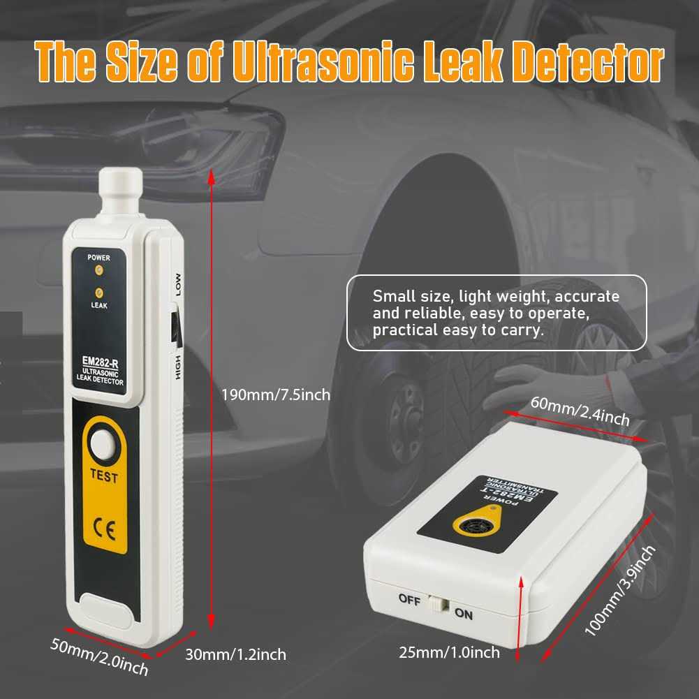 Leak Detection Tools, Ultrasonic Leak Detector & Transmitter Electronic Stethoscope Air Leak Detector Noise Detector Snoop Leak Detector for Pipeline, Air Conditioner, Automobile Glass Leak Detection The working principle: If a container or pipe is filled with gas, when its internal pressure is stronger than the external pressure, due to the large internal and external pressure difference, once the container has a leak, gas will be flushed out of the leak hole. When the size of the leak hole is small and the Reynolds number is high, the turbulence will be formed when the gas blows out. The turbulence will produce a certain frequency of sound waves near the leak hole. The frequency of the acoustic wave vibration is related to the size of the leak hole. Audible sounds can be heard. When the leak is small and the sound wave frequency is high, the human ear cannot hear it, but they can spread in the air and are called no-load ultrasonic waves. Ultrasound is a high-frequency short-wave signal, and its intensity rapidly decays as the propagation distance increases. Ultrasonic waves have directionality. With this feature, the correct leak location can be determined. Transmitter: Indicator : LED Operating Condition : Temperature : 0 ~ 40C Relative humidity : less than 80 percent Output Frequency : 40kHz Battery : 9V Low battery Indication : “”POWER””LED can’t light Size : Transmitter :101 x 59 x 28mm /Main Unit; 192mm x 50mm Item Weight : Transmitter : about 90g (including battery) /Main Unit : 115g Receiver: Notifications Indication : The “”LEAK”” LED lights and the “”ticking tone”” increases in frequency Frequency Response : 40kHz +/-2kHz Operating Condition: Temperature : 0~40C Relative humidity : less than 80 percent Battery : 2 x 9V Battery (FREE) Size : 192 x 50 x 30mm Weight : about 115g earphone: Connect the earphone to the earphone jack of the leak detector, put on the earphone, operate the detector, and judge the location of the leak according to the indicator light and the frequency sound emitted by the earphone Read more Way of working: The EM282-R can work with dynamic and main dynamics. When real- time inspection of the gas pipeline, it can be used alone, use it to capture the tiny ultrasonic signals generated when the gas leak, you can determine the correct location of the leak. This way of working is called dynamic. When the EM282-R and EM282-T are used together, non-real-time inspection can be performed on the object to be inspected. That is, an ultrasonic signal of