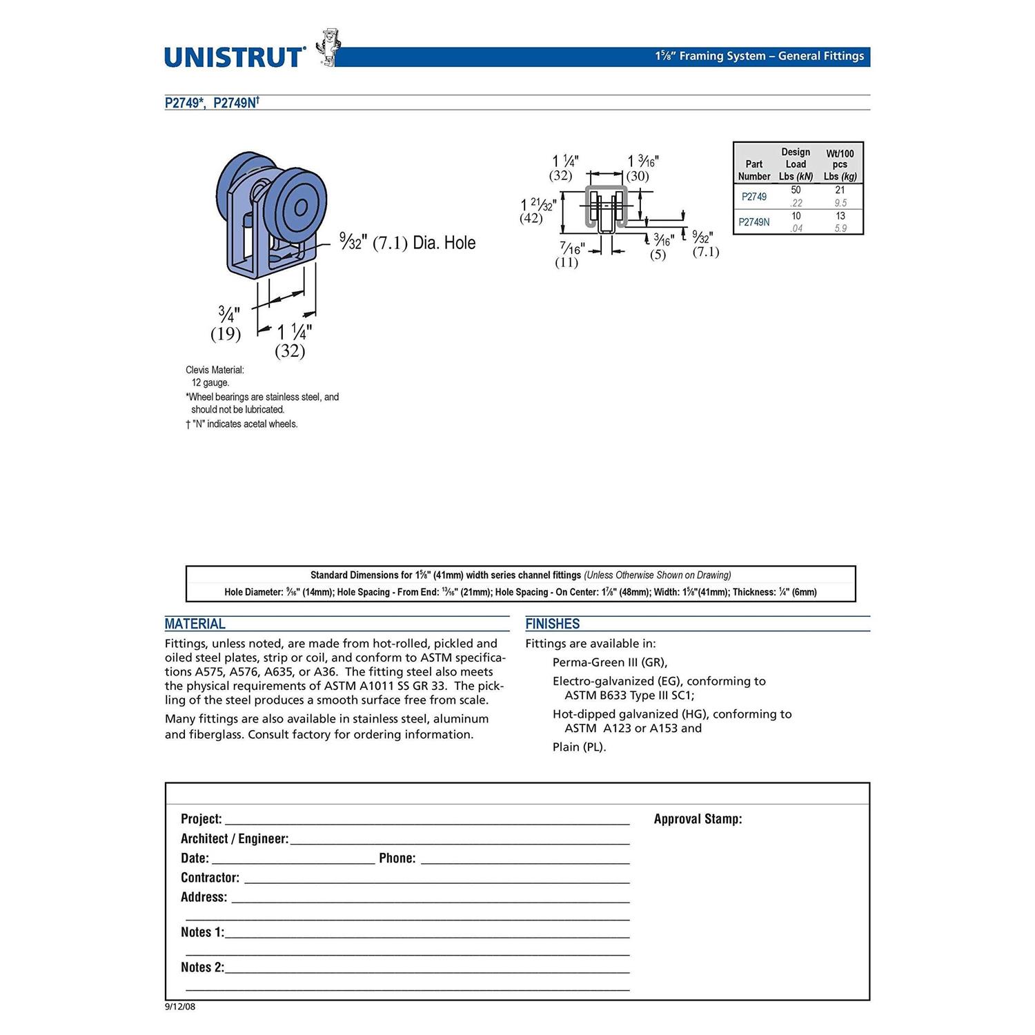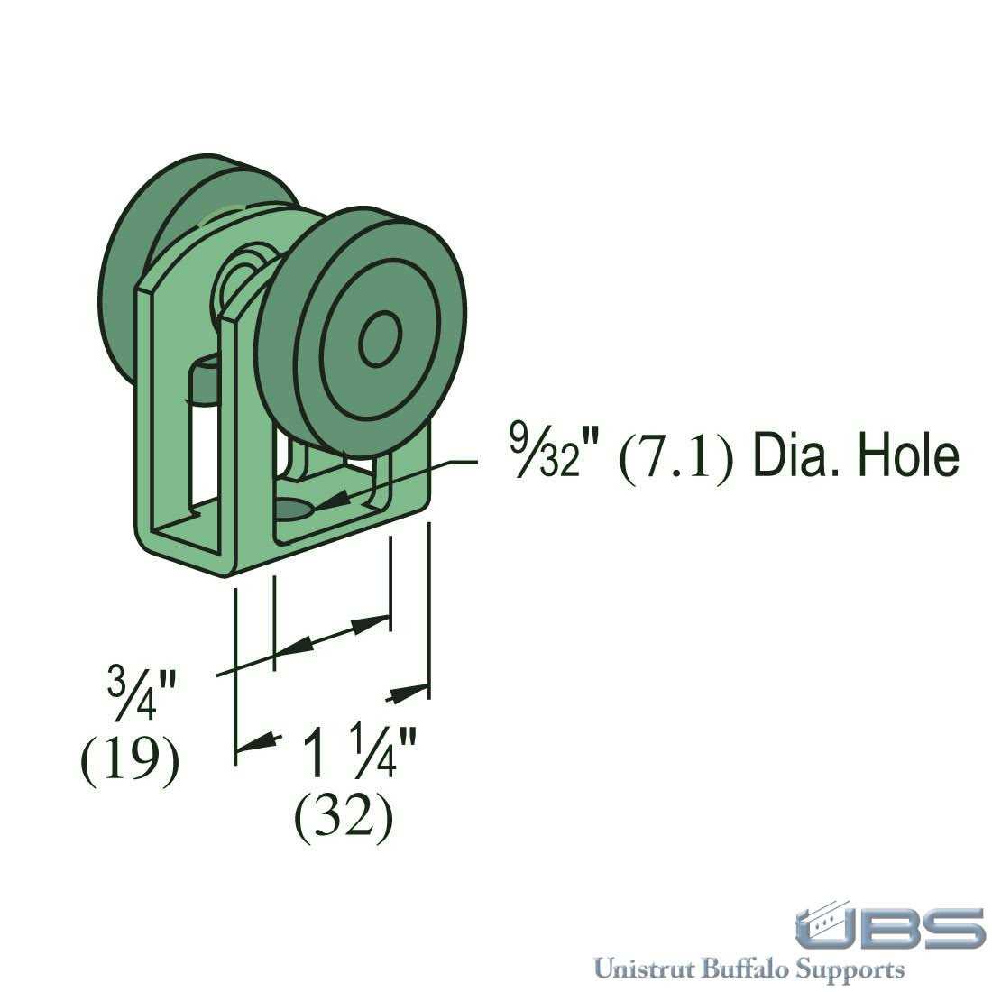 Unistrut 2 Wheel light duty trolley has high quality system components that are specially designed to work with the framing system. Trolley is made from 12-gauge steel and features ASTM B633 Type III SC1 electro-galvanized finish. It is ideal for use with 1-5/8-Inch width series channel. It has 1-1/4-Inch width. Trolley has a load capacity of 50 lb. It has a zinc coating of 0.2 and is designed for indoor usage. Bearing of wheel trolley is stainless steel and has 12 gauge clevis material.