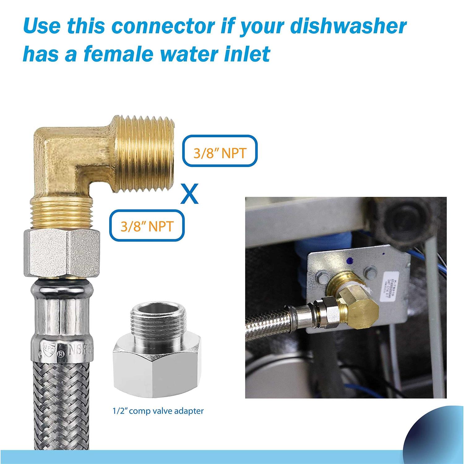 Complete installation kit: Set includes one universal 3-wire power cord (6 Ft.), one stainless steel braided hose with 3/8” compression ends (6 Ft), one 90o 3/4” garden hose elbow, one 3/8” male elbow, one 1/2” comp valve adapter, one 1/2” FIP valve adapter, one 3/8″ tee compression fitting and 3 plastic wire nuts No-lead, burst proof: High quality stainless steel braided hose is corrosion resistant, anti-rust, kinking and crimping proof. This line withstands more than 200psi (1500psi burst) and 158°F water temperature. Premium brass connectors and stainless-steel adapters guarantee long lasting and corrosion resistance Universal dishwasher installation kit: This kit is all you need for a dishwasher safe installation, fits most dishwasher brands. Convenient, easy for a first time installation or to replace the old one Dishwasher installation kit, this kit is suitable for most dishwashers, specially designed for residential dishwashers. /br /br Strong and durable materials: /br /br -Braided hose: Strong flexible PVC core and premium stainless-steel knitted exterior dishwasher hose prevents kinking and crimping. Even after repeated bending, it still maintains its original shape. Burst proof hose design. /br /br -Compression elbow and FHT elbow: High quality rust resistant brass pieces, easy to clean and maintain. /br /br -Angle stop add-a-tee splitting water supply fitting : This valve adds an outlet on an angle dishwasher stop valve in case you need another outlet. It has a 3/8″ compression inlet x two 3/8″ compression outlets. Brass material provides high temperature ductility and low magnetic permeability, more durable than iron and iron galvanized products. /br /br Most complete dishwasher installation kit: /br /br -6 Ft. straight power cord /br -6 Ft. water line hose /br -3/8 inch MIP elbow /br -3/4 inch FHT garden hose elbow /br -3 wire nuts /br -3/8 inch compression angle stop Add-A-Tee valve /br -1/2 inch comp valve adapter /br -1/2 inch FIP valve adapter