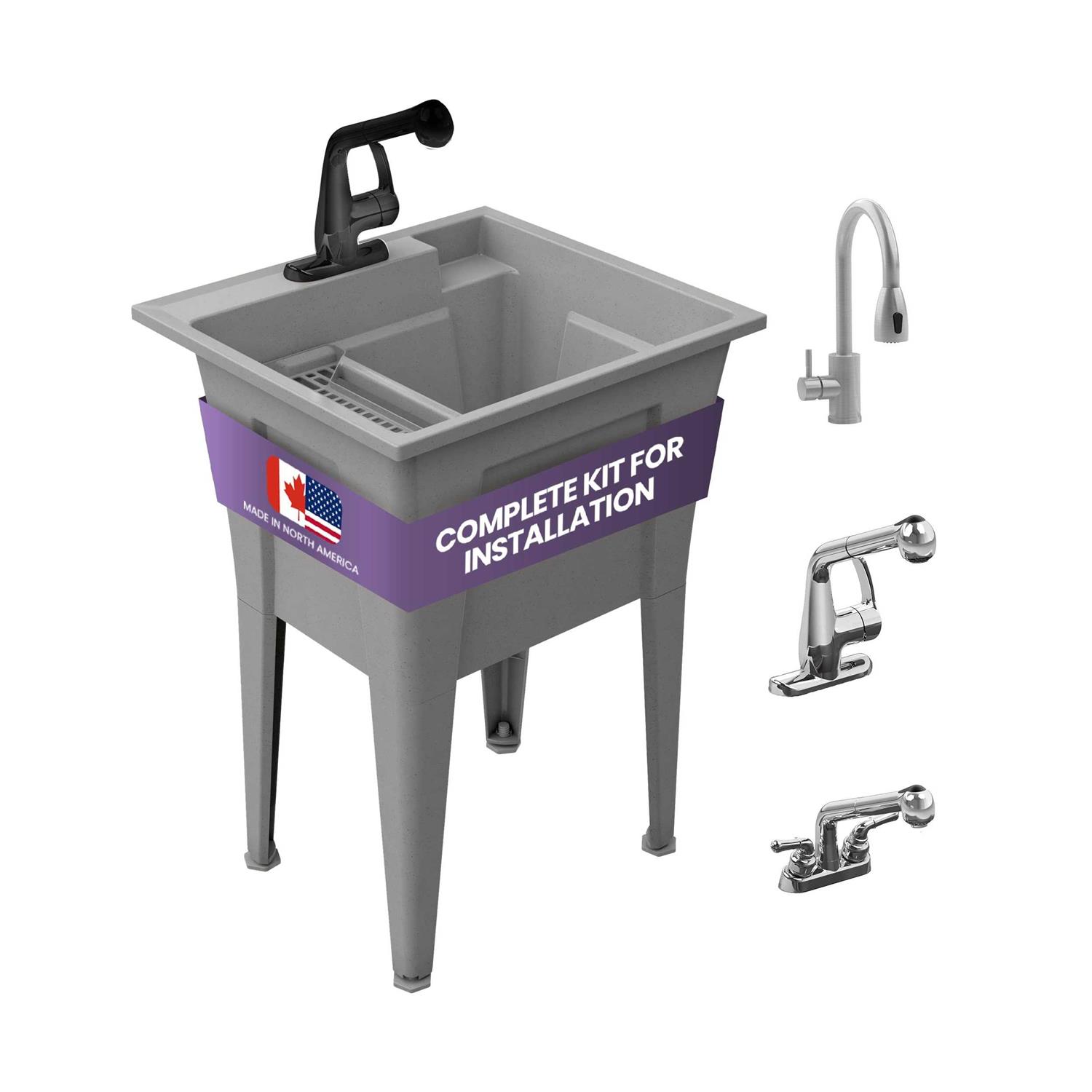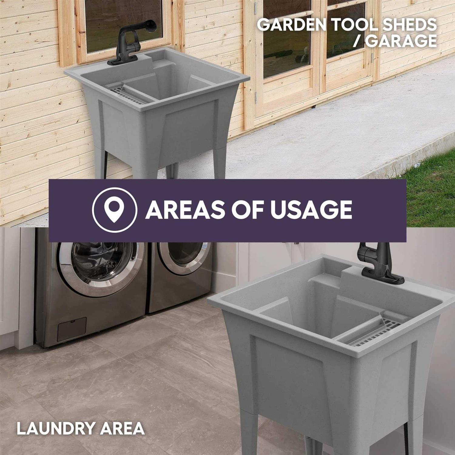 Utility Sink with One-Handle Matte Black Plastic Faucet – Polypropylene Laundry Sink, Grey Garage Sink, Indoor & Outdoor Use – Complete Sink Set by