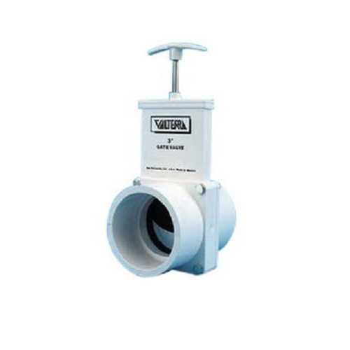 PVC Slice Gate Valve Features Designed for pool & spa, irrigation, plumbing, waste waterand agricultural applications. Stainless steel shaft prevent rust and corrosion. Ozone & chemical resistant Santoprene materials. Santoprene seals are integrated to the paddle to eliminate any chance of torn orpunctured gaskets. Maximum working pressure 50 psi (through 2). Solvent cement traps to catch excess glue. Every valve tested at double recommended working pressure. Valterras patent pending triple o-ring neck seal to ensure against any chance of shaftleakage.3 Piece body Three piece configuration allows for repair or can be used as a union. Three piece configuration easily disassembles for inline service.