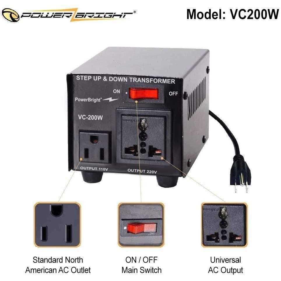 Power Bright series of step up/down voltage transformers offers you a safe, reliable, affordable & convenient solution to converting voltages from 110-120 volt up to 220-240 volt or from 220-240 volt down to 110-120 volt for both home use & industrial applications. The VC200W is rated at 200 watts maximum. There are a total of two outputs on the front panel. For safety, its recommended by the manufacturer that the voltage transformers maximum power should be equal or greater than the power rating of your appliance multiplied by 1. 5. For example, if you have an appliance rated at 100 watts, you will need to pick a transformer with a maximum power of 150 watts or greater.