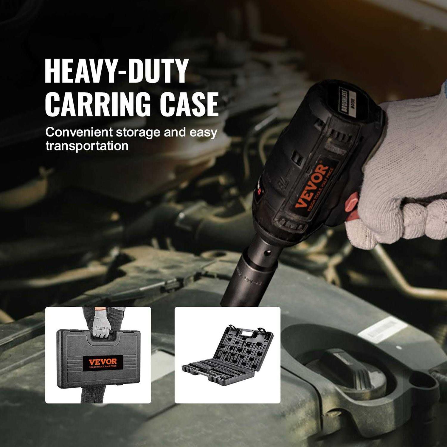 Cr-V Industrial-Grade Alloy Steel: Crafted from premium impact-grade alloy steel, our 3/8 impact socket set with Cr-V industrial-grade alloy steel offers exceptional enhancements in impact resistance and absorption. Through the utilization of vacuum heat treatment, the steel undergoes rapid heating and cooling processes, resulting in a polished and highly durable surface. This makes it well-suited for a wide range of operational environments. High Torque: Distinguished by its hexagonal drive design, which sets it apart from traditional designs lacking rounded corners, this socket tool set significantly reduces pressure exerted on fasteners during impact. As a result, it minimizes wear and effectively prevents bolt rounding and stripping. Easy-to-Read Size Markings: The size markings on these 48pcs impact driver socket set are meticulously laser-etched and rolled, ensuring effortless identification of socket sizes even in low light conditions. Convenient Storage & Transportation: The set is accompanied by a moderate-weight metal toolbox, providing convenient portability. The toolbox facilitates organized storage of the tools after use, eliminating the risk of unnecessary scattering or loss. Abundant Components: This comprehensive set includes an array of components, such as deep and standard sockets 8mm, 9mm, 10mm, 11mm, 12mm, 13mm, 14mm, 15mm, 16mm, 17mm, 18mm, 19mm, 20mm, 21mm, 22mm, 5/16″, 3/8″, 7/16″, 1/2″, 9/16″, 5/8″, 11/16″, 3/4″. Other components include extension bars in lengths of 3″and 6″, 3/8″ universal adapter, and 1/2″F x 3/8″M adapter.
