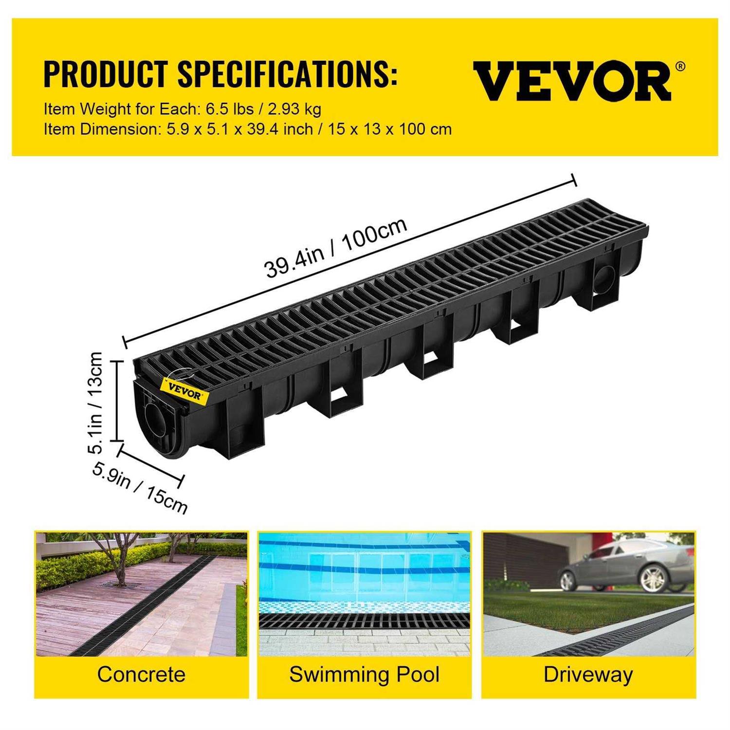 This VEVOR driveway trench drain provides an effective collection and drainage of water. Made of durable HDPE plastic, it works efficiently and has a long service time. With the interlocking connection design, you can install it easily. The drain is one meter long each. It can be connected together to fit your need. It holds up to 6600 lb. and it is an ideal choice for your garage. Also, it is suitable for the garden, pool, walkway, courtyard, and other outdoor places.