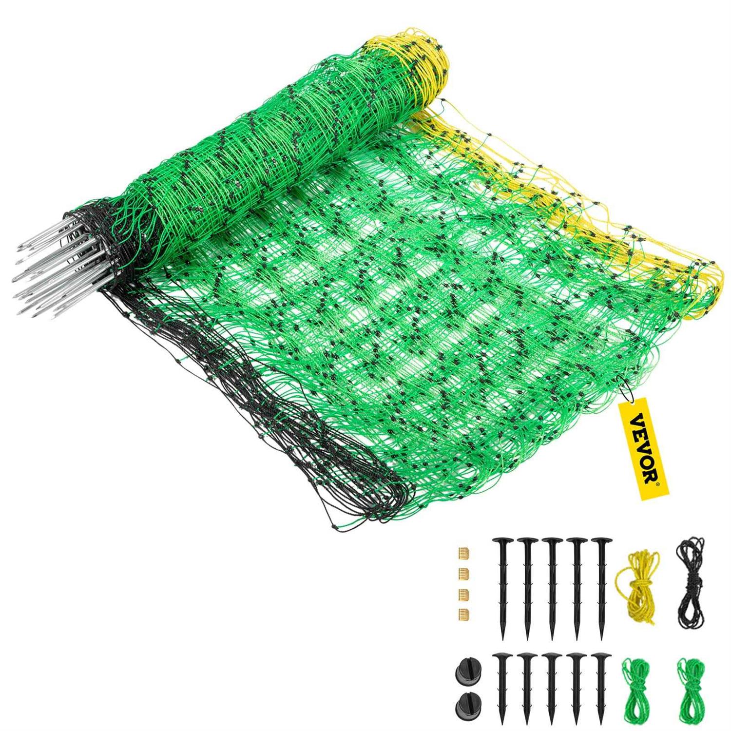 Our VEVOR electric fence netting with 14 posts and steel spikes is stable and durable for long-term use. The effortless installation makes it suitable for both permanent and temporary applications. Electrify with a fence energizer and then you can enjoy your easy grazing, no worry about predators or unwanted animals. Small mesh width in the lower area for increased protection Made of high-strength PE for long-term outdoor use 0.5 Joule solar or AC/DC stimulator recommended 35.4 in. Our pre-fabricated electric net fence requires no assembly, just unroll the fence, place it into the ground and power it up Wide application: the electric netting fence is suitable for keeping predators and unwanted animals out, creating a secure space for your sheep, goats, cattle, deer, hogs, large dogs, rabbits and other livestock Lightweight enough to transport, store and convenient for rotating grazing or scaling up your protection Give a smart appeal to your garden space by selecting this amazing VEVOR Electric Fence Netting H x L PE Net Fencing with Utility Portable Mesh for Farms Green.