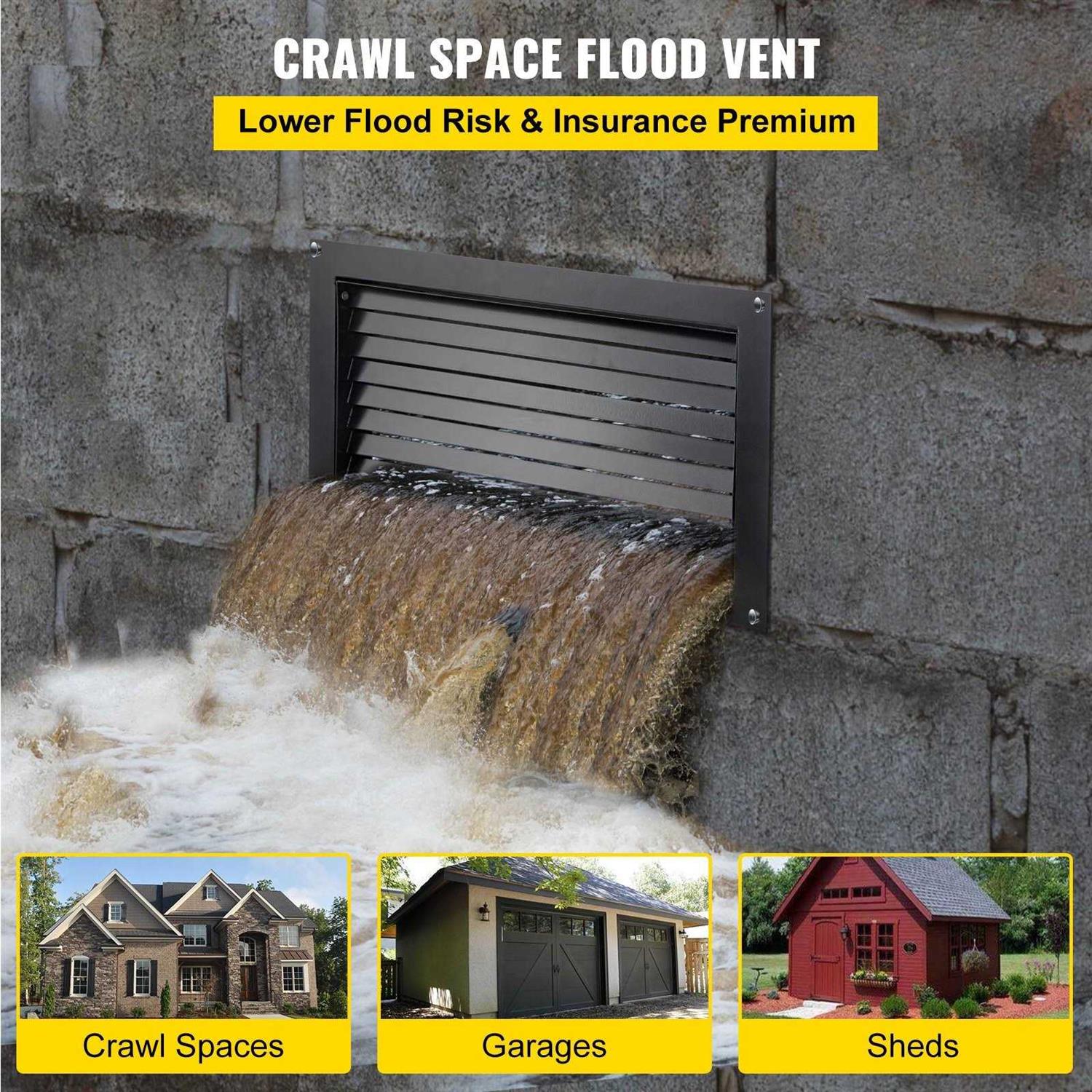 VEVOR Crawl Space Flood Vent, 12 inch Height x 20 inch Width Foundation Flood Vent, to Reduce Foundation Damage and Flood Risk, Black, Wall Mounted Flood Vent,for Crawl Spaces,Garages & Full Height Enclosures Reduce Flood Risk Detachable Louvered Plate Easy & Convenient Installation Rigid Zinc Coated Steel Surface Paint Treatment Durable Welding Craft Opening Dimensions(W x H): 20 x 12” / 508 x 304.8 mm,Thickness: 0.03” / 0.75 mm,Plug Profile: Wall,