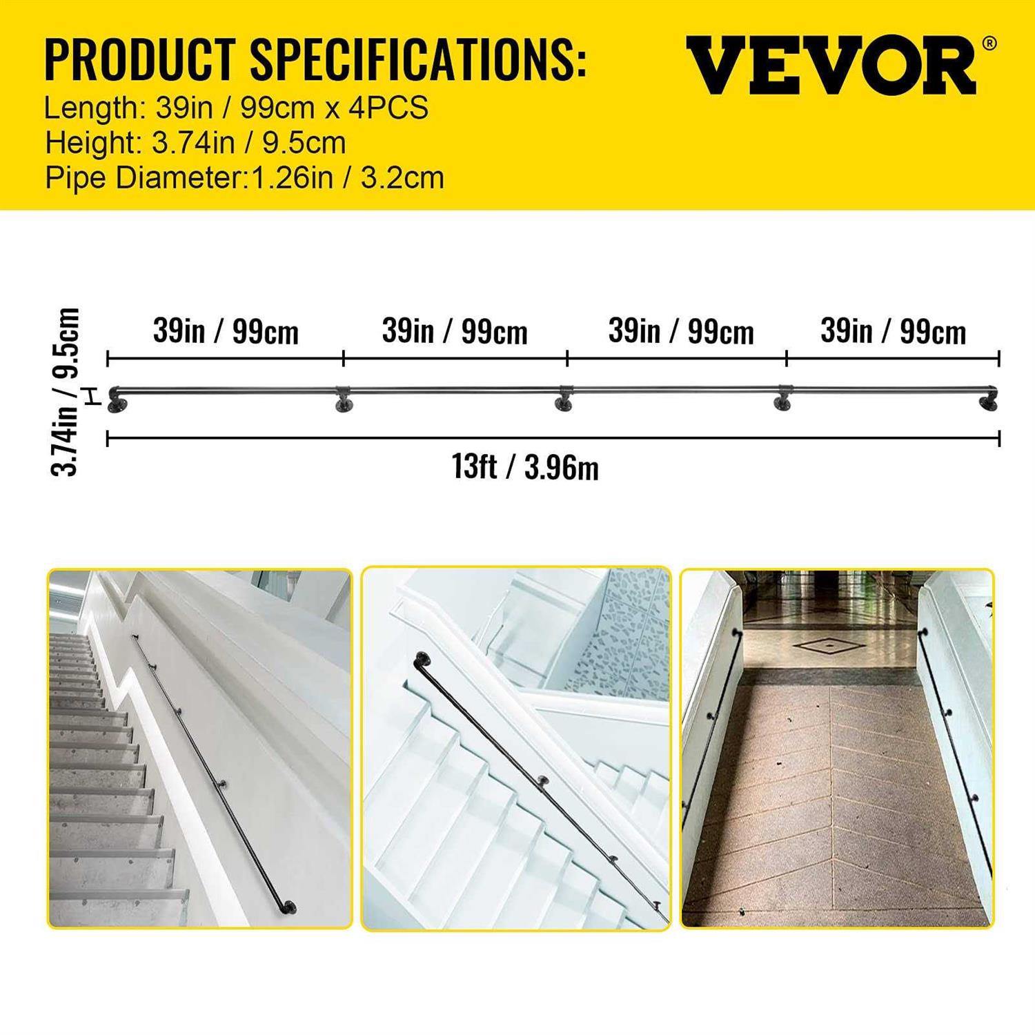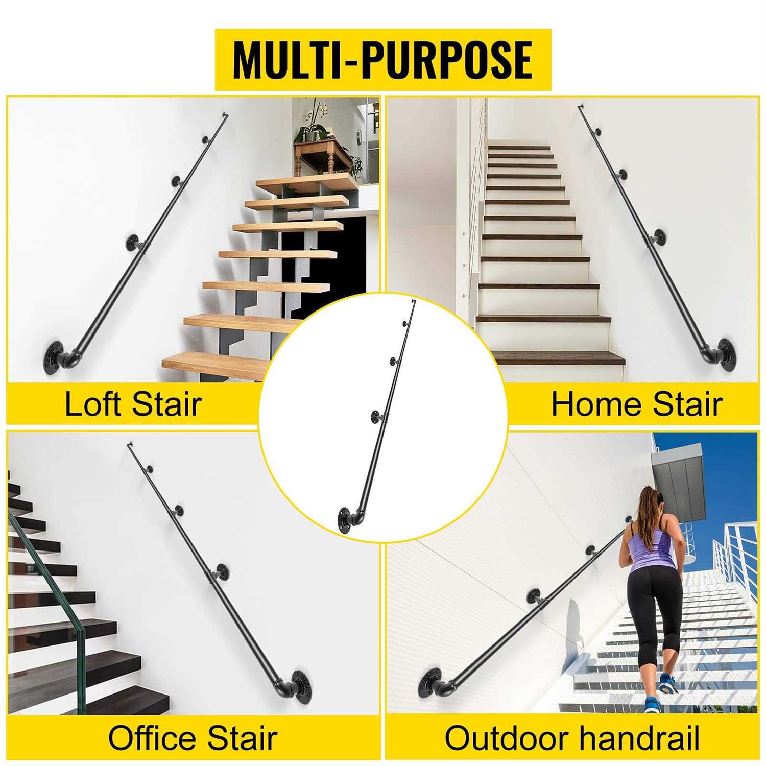 Our VEVOR wall mount handrail is combining with elegance, versatility, easy installation, and security. Each bracket holds up to 440 lbs. loading. Outdoor-dedicated spray paints on the carbon steel pipe surface provide long-term service for both indoor and outdoor handrails.