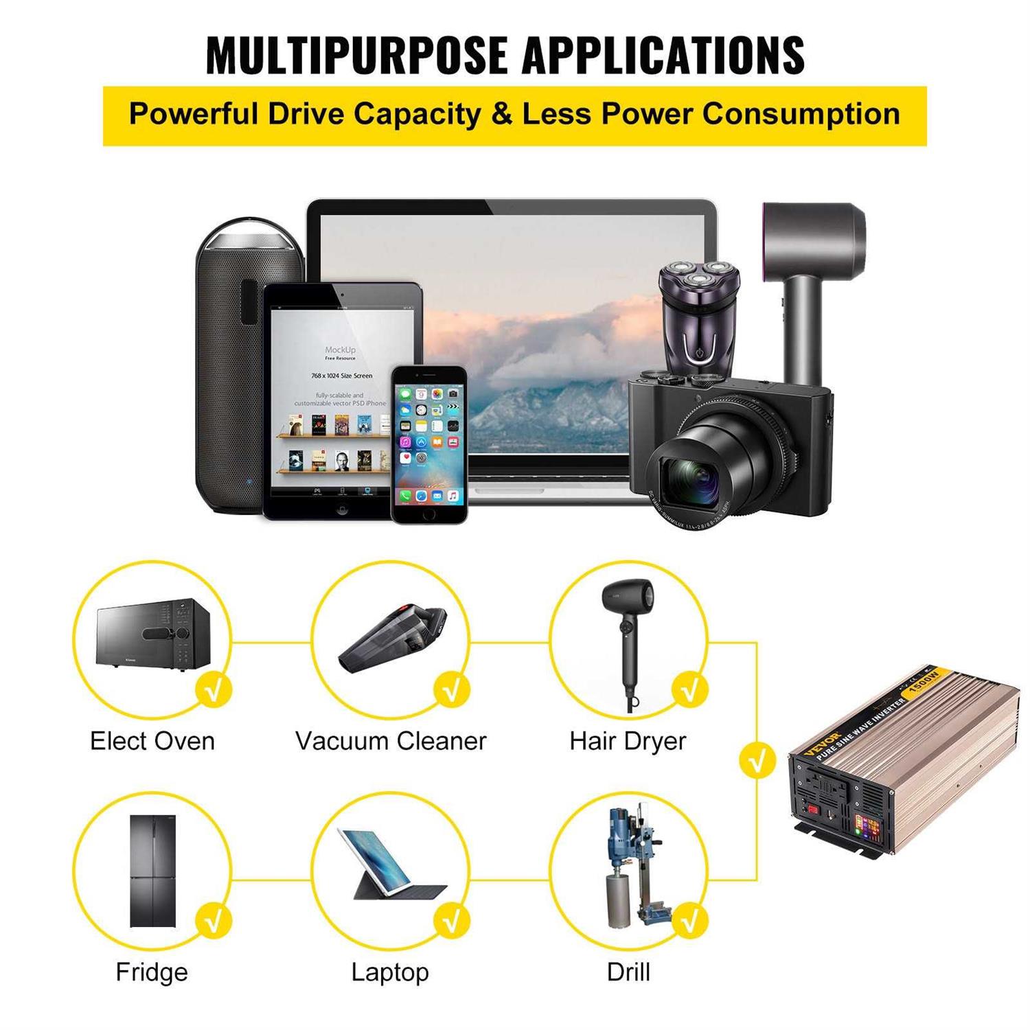 - VEVOR Pure Sine Wave Inverter Power Inverter 1500W DC12V to AC110V Converter LCD
