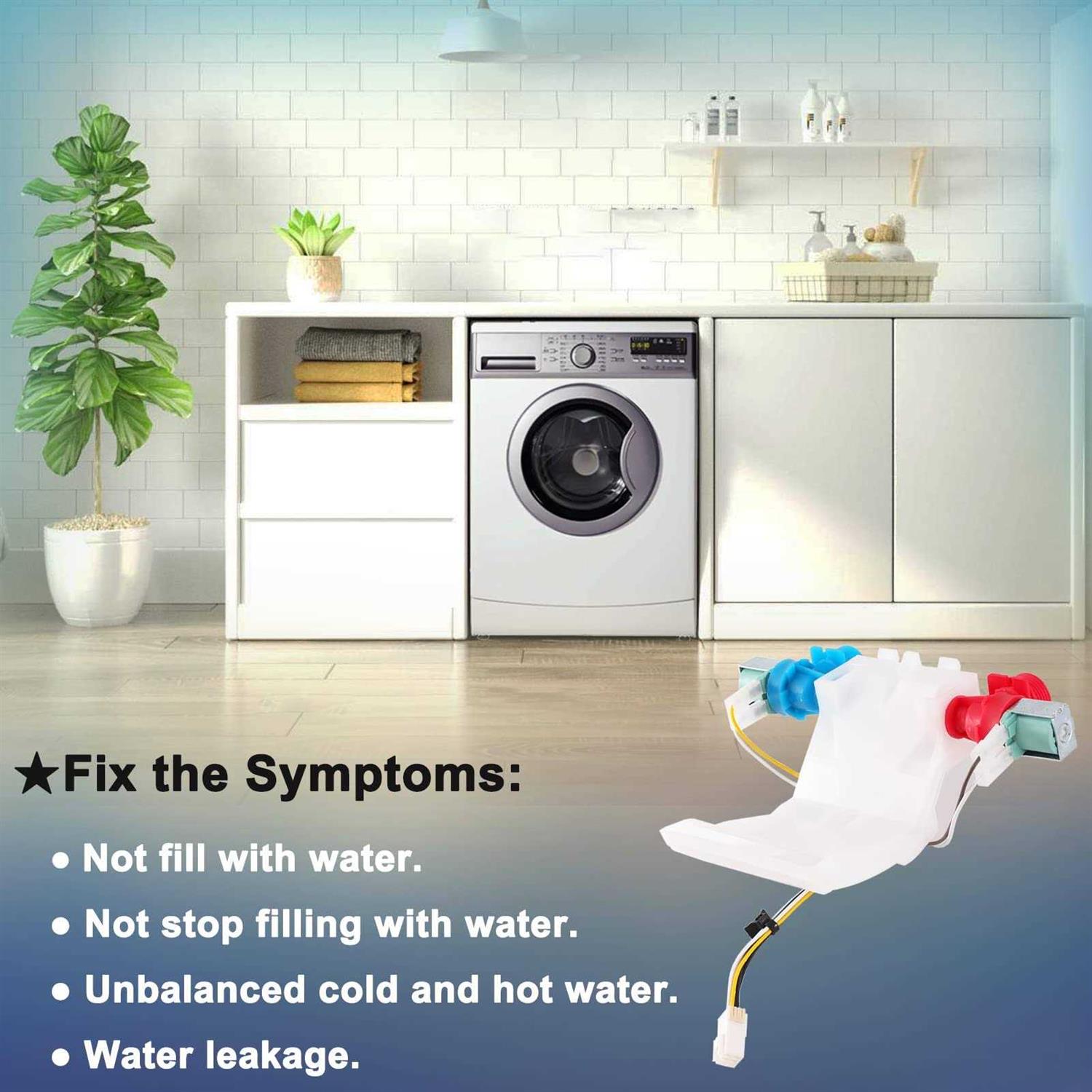 Replacement Parts by AUGSMIAR. Details: Fixes Following Symptoms: Not fill with water. Not stop filling with water. Unbalanced cold and hot water. Water leakage.22 x 9.06 x 4. Compatible with Brands and Models: whirlpool washing machine 7MWT98820WM1, 7MWT98825WW1, 7MWT98840WW1, 7MWT98960WM1, 7MWT98965WW1, 7MWT99840WW1, 1CWTW5200VQ1, 1CWTW5300VW1, 1CWTW5505VQ1, 1CWTW5590VQ1, 1CWTW5790VQ1, etc. roper washing machine RTW4305VQ1, RTW4305VQ2, RTW4305XQ0, RTW4440VQ1, RTW4440VQ2, RTW4440XQ0, etc. meytag washing machine MVWC300VW1, MVWC400VW1, MVWC450WW0, MVWC500VW1, MVWC700VJ1, MVWC700VW1, 7MMMS0560WW0, 7MMTS0520WW0, etc. estate washing machine ETW4400WQ0, ETW4400WQ1, ETW4400XQ0, etc. The brand names or model names mentioned to this product is only used to prove compatibility.