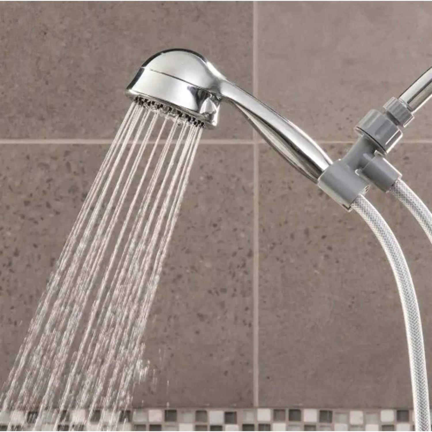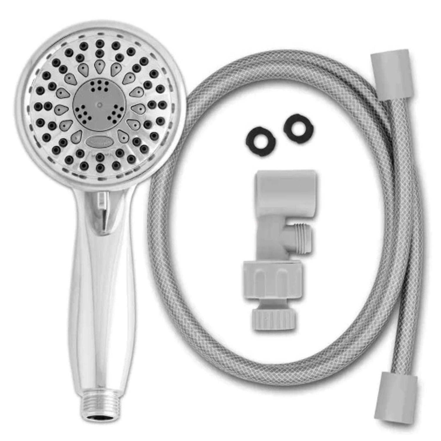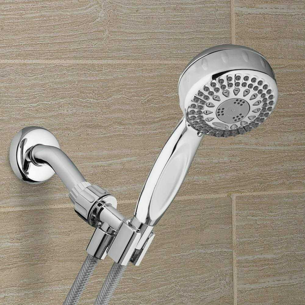 Handshower in Chrome offers a customized showering experience, allowing you to choose from five (5) spray settings to best suit your needs. This hand held shower head features a spray control ring that lets you easily switch from 1 spray setting to another. The 5 ft. hose helps bathe children and pets and makes it easier to clean and reach difficult areas. Designed for simple maintenance, the easy-clean nozzles help reduce mineral and hard water buildup for a cleaner bathroom environment.