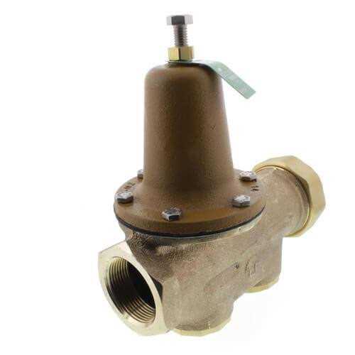 This 3/4 in water pressure reducing valve is used in commercial and residential applications to reduce incoming water pressure for protection of plumbing system components and to reduce water consumption. It consists of a lead-free brass body construction, NPT threaded union female inlet by NPT female outlet connection, integral stainless steel strainer, thermoplastic seat, bronze sealed spring cage for accessible outdoor waterworks or pit installations and a thermal expansion bypass. The temperature range is 33 to 180 deg F.