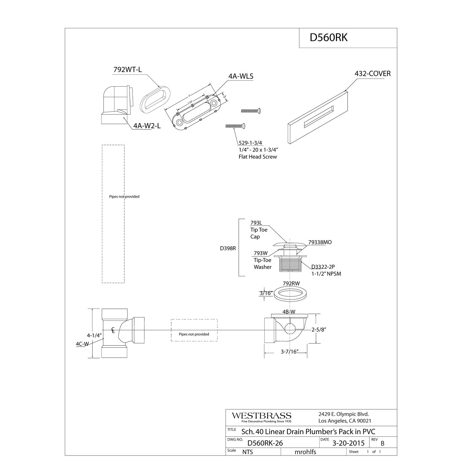 The Linear Bath Waste & Overflow from Westbrass features a sleek rectangular overflow cover which beautifully finished the inside of the overflow channel. The ADA approved toe tap drain is easy to operate; press once to close and again to open the drain. This drain type is the easiest to use for all bathers. Pipe is not included. Features. Schedule 40 PVC Tee and Elbows – pipe not included. Linear overflow cover mounts on spacer inside tub for a super clean look. ADA approved touch toe drain for easier useSpecifications.