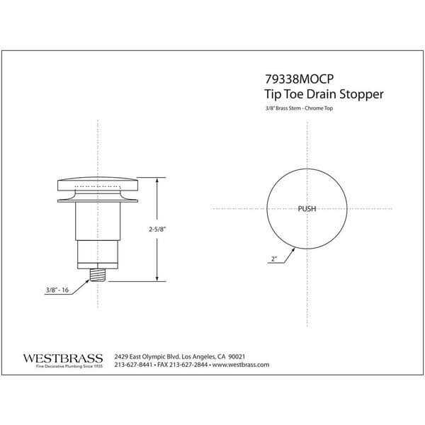 Westbrass 79338MOCP Tip-Toe Bath Mechanism in ChromeUse this tip toe mechanism from Westbrass in your bath tub. The stem fits drain shoes with 3/8 in. tapped holes. The heavy-duty cap is finished in Polished Chrome to match your existing fixtures.
