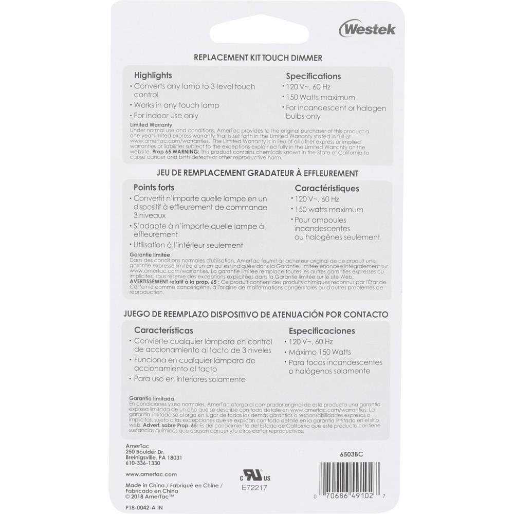 Add convenience to your lighting system with this Westek Wire-in Replacement Kit Touch Dimmer. The kit comes with a universal #6503BC model that is compatible with AC current type and 120 Vac voltage. The touch dimmer ensures smooth operation and is ideal for controlling the light intensity in your home or office. With a power capacity of 150 W, this dimmer is an efficient and reliable choice for your lighting needs. Get your hands on this easy-to-use dimmer and enjoy the convenience it provides.