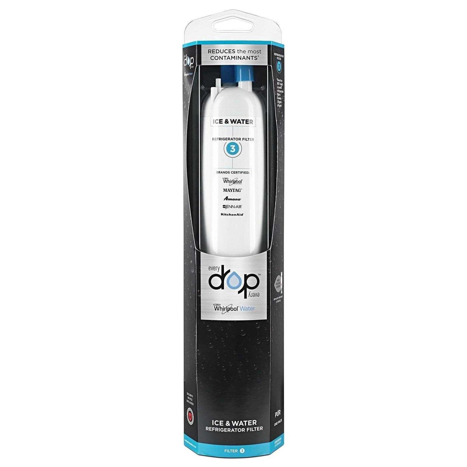 Enjoy fresh, filtered water and ice from your refrigerator. Filter 3 from EveryDrop by Whirlpool Water Ice and Water is certified by NSF to reduce 73 contaminants – including pharmaceuticals, pesticides, waterborne parasites, lead, asbestos and industrial chemicals in addition to providing great tasting water by reducing the presence of chlorine. Each filter provides 200 gallon of filtered water and should be changed every 6 months to ensure proper contaminant removal and flow rate.