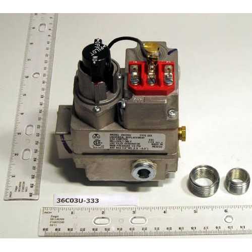 The 36C03-333complete gas controls combine into a single compact package the functions of 3-position gas cock pressure regulator 100% shut-off automatic pilot and main operator. Separate models are available for use on 24 VAC and .750 VDC systems. These controls can be mounted in any orientation except upside down.