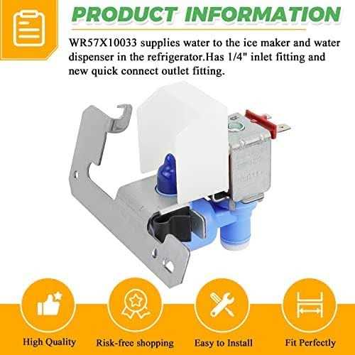 【WR57X10033 WATER INLET VALVE】Water inlet valve assembly WR57X10033 ap3189335 supplies water to the ice maker and water dispenser in the refrigerator. Refrigerator water valve WR57X10033 has 1/4″ inlet fitting and new quick connect outlet fitting. This single outlet valve has 1/4-inch compressions fittings and is intended for use with refrigerators that make crescent-shaped ice cubes. You can replace worn out parts for refrigerators, Safely store any food that could deteriorate 【PACKAGE INCLUDES】1 x WR57X10033 Refrigerator Water Valve Replacement with Guard. The WR57X10033 ap3189335 Refrigerator Water Inlet Valve is made of high quality materials and well-tested by the manufacturer, Ensure long-lasting and effective performance. WR57X10033 Water Inlet Valve can repair the following symptoms: 1Ice maker leaked 2Water will not dispense 3Ice maker does not make ice 4Ice machine inlet tube froze up. Fast official Amazon logistics 【COMPATIBLE MODEL】WR57X10033 Water Inlet Valve compatible with G-E, Hotpoint, Ken-more refrigerator. The excellent quality and the best price help you have a better quality of life 【DIY INSTALLATION】Be sure to disconnect the water and power sources from the refrigerator before you begin this repair. Wear work gloves to protect your hands. You will need tools includes crescent wrench, screwdriver. As per the manufacturer, this valve has a new quick connection. You must cut the retaining nut off your current plastic water line, and gently push it into the new valve.