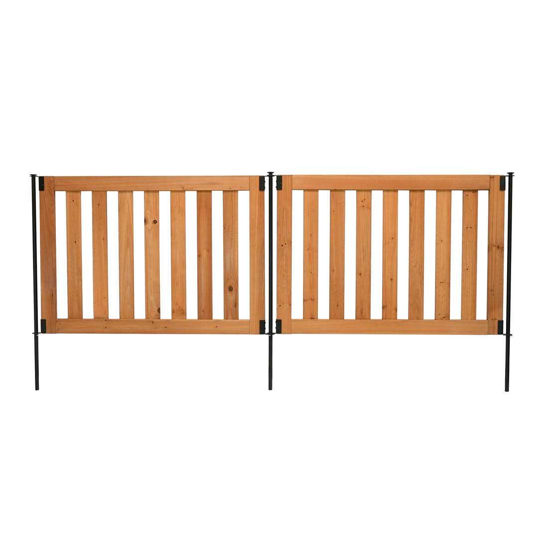 Looking for a fence that is easy to assemble and elegant looking? Then the Newberry Wood Fence Kit is perfect for you! Each DIY kit comes with two unassembled fence panels that take around 60 minutes to assemble. Each panel measures 48in W by 32in H and is fully scalable which means you can add on as much fence as you need for your project. This fence is perfect for creating barriers and borders in your outdoor living spaces such as gardens, patios, and front and backyards to help keep your pets and children safe! The spacing between pickets is 2 1/3in, ensuring that pets cannot escape. Our innovative no dig design allows you to insert the included stakes through the stake brackets and hammer into the ground without digging or pouring concrete. This installation method also allows you a wide range of motion with your fence, configuring to your needs. Stake pegs are included for you to lift your bottom fence rail off the ground and prevent rotting. In addition, the bottom rail has drainage holes to also prevent rotting and prolong the life of your fence. The ground stakes are galvanized, rust resistant, powder coated, and made to withstand weather. Your panels will come with a water-based stain applied that is safe for both pets and children.